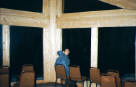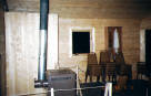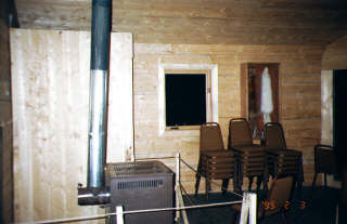 観測室は広い窓のあるおおきなログハウス。そとに比べれば暖かいが、椅子しかないので寒い。 オーロラは1時間ごとくらいに出るのでここで待つ。 |