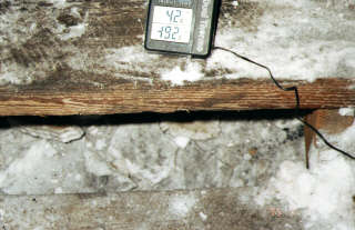 温度計を持っていった。現在室内4.2度、外はマイナス19.2度。 まだどんどん下がる。そのうち液晶が凍って測定不能になった。 |