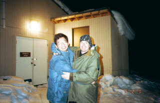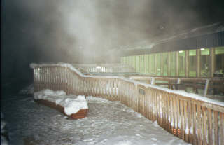 観測のあと温泉に入る。露天風呂もある。 湯船からあふれた水はたちまち凍る。タオルを外に出すとたちまち板のようになる。 むろん水着を着て入る。 |