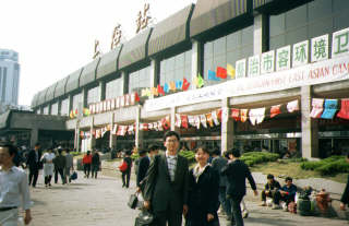 北京に列車で向かう。中国旅行社の方に車で送っていただいた。大学で日本語を学んでいる女性だそうです。きれいなかたでした。記念に上海駅前で。 |