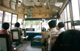 バスのなかには車掌がいて寝ていた。 どうやら行き先を告げて切符を買うらしい。とりあえず人数のつもりで指を2本立てたら、2区間分の切符を売ってくれた。 |
