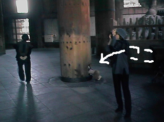 ちょうど大仏さまの裏の柱の根元に穴があいています。