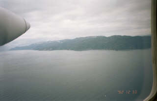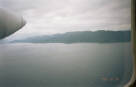 15分後、左手に佐渡ヶ島が見える。写真を撮ろうと2人で左に寄ったところ、機体の安定のため、寄らないように指示される。 |