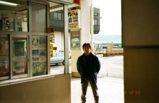 両津港、バスターミナルに到着。9時30分。朝、東京を出発して3時間で佐渡ヶ島に到着。が…しかし。 定期観光バスの出発時間は9時20分だった。朝ご飯にした。 |